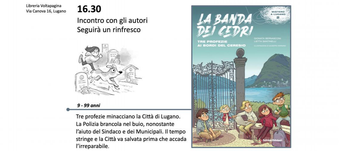 Tra gli scaffali della Libreria Voltapagina, gli autori del libro racconteranno aneddoti sulla città di Lugano e curiosità sulla nuova avventura della Banda dei Cedri, "Tre profezie ai bordi del Ceresio".