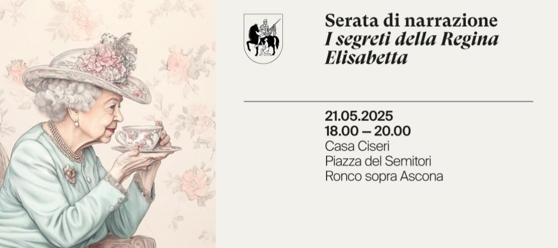 Avvolti dai decori raffinati di Casa Ciseri e dal profumo di un autentico tè all’inglese, saremo incantati da curiosità, aneddoti e storie inedite della Regina Elisabetta. Un viaggio sorprendente -da Arcegno a Buckingham Palace - narrato con brio dal maggiordomo e da una misteriosa cuoca di corte.