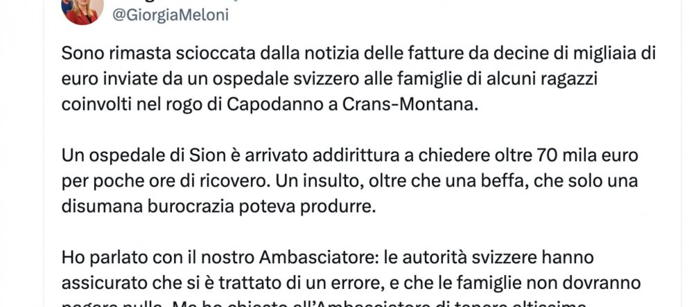 Fatture ospedaliere di Crans, pago io o paghi tu? Meloni: "L'Italia no!"
