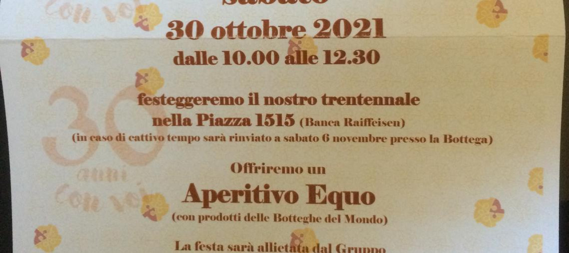 sabato 30.10.21 sulla Piazza 1515 verrà offerto ai presenti un Aperitivo Equo (con prodotti delle Botteghe del Mondo), e un buono sconto del 20% valido per tutto novembre sull'intero assortimento del nostro negozio.