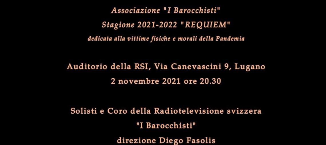 Il Coro della Radiotelevisione svizzera e I Barocchisti diretti da Diego Fasolis in collaborazione con RSI presenteranno al pubblico, nella ricorrenza del prossimo 2 novembre, una Messa da Requiem ed altre composizioni strumentali e vocali di Antonio Caldara in occasione del secondo appuntamento della stagione concertistica 2021-2022 dedicata alle vittime fisiche e morali della pandemia. Il concerto avrà luogo presso l’Auditorio Stelio Molo della RSI martedì 2 novembre alle ore 20.30. Solisti: Laura Antonaz (soprano), Raffaele Pe (alto), Elena Carzaniga (alto secondo), Alessio Tosi (tenore), Matteo Bellotto (basso).