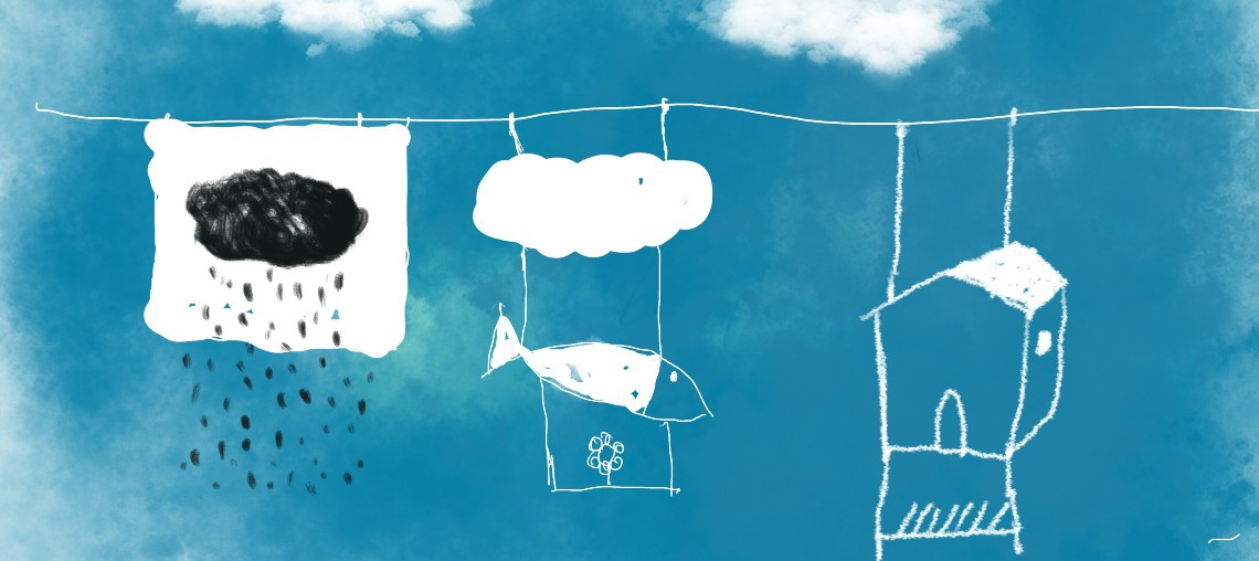 Due lavandaie lavano i loro panni sul bordo di un ruscello immaginario, e tra giochi gocciolii di acqua stendono i loro panni come se fossero nuvole. Due lavandaie di nuvole che le lavano per poi riappenderle trasformandole in animali, alberi, universi, sapendo che il destino di queste bianche creature è il mare che come grande madre le accoglierà con la tenerezza e la gioia di un ritorno a casa là dove tutto è nato.