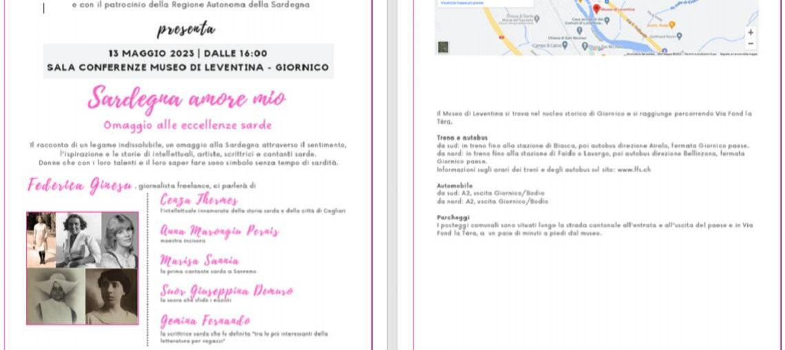 Al termine della relazione illustrativa delle eccellenze femminili della Sardegna, seguirà un aperitivo con prodotti tipici sardi e vini della Cantina Bettoni di Giornico.