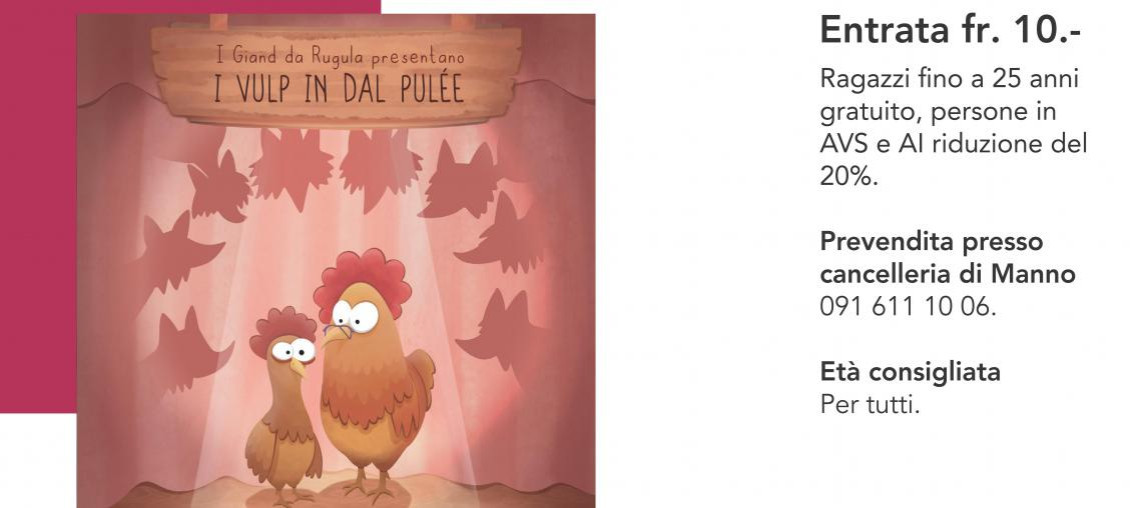 I Comuni ABM – Agno, Bioggio e Manno – vi invitano alla commedia dialettale “I vulp in dal pulée” della compagnia teatrale I Giand da Rugula di Coldrerio, diretta da Gionas Caldelari. Una brillante storia ricca di situazioni imprevedibili e battute irresistibili che saprà coinvolgere il pubblico di tutte le età.
