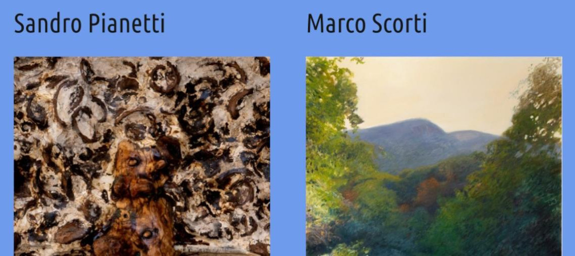Invece nelle sculture e nei bassorilievi di Pianetti è l’artista stesso a impiegare elementi naturali e a elaborarli. Per entrambi il punto di partenza è la passeggiata all’aria aperta, in cui Scorti identifica le tonalità di colore che successivamente riproduce, mentre Pianetti raccoglie nella natura objets trouvées che poi modifica: funghi degli alberi, resina e legno, in particolare.