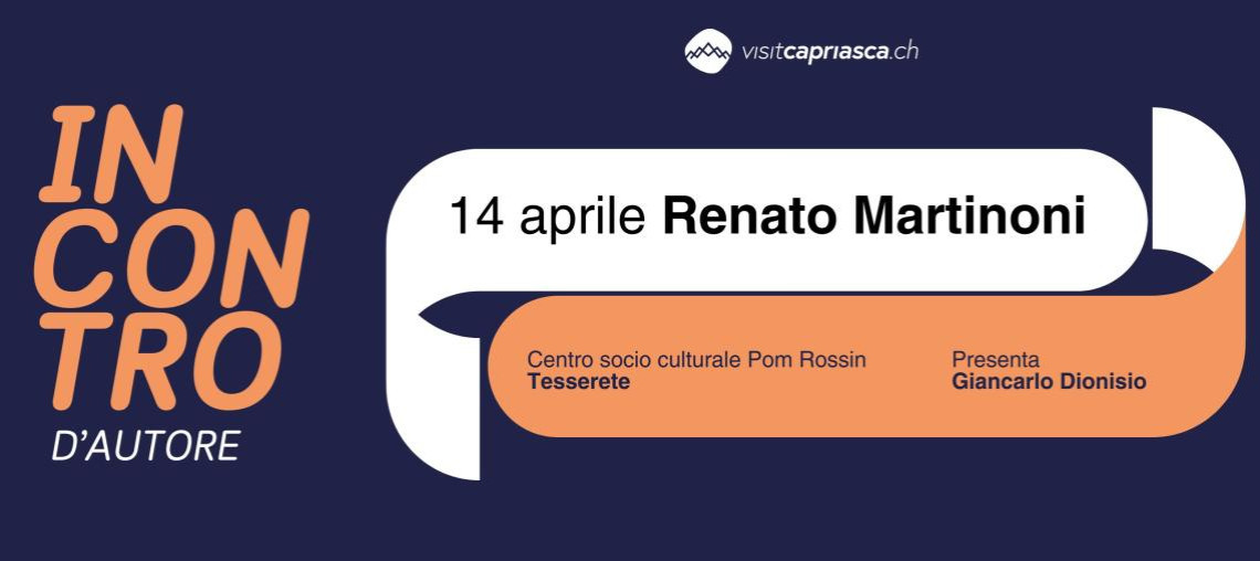L’Ufficio cultura, eventi, sport e turismo del Comune di Capriasca ha il piacere di annunciare un nuovo appuntamento della rassegna Incontri d’autore, che si terrà martedì 14 aprile alle ore 18:30 presso il Centro Socio-Culturale Pom Rossin di Tesserete. Protagonista della serata sarà Renato Martinoni, autore, critico letterario e docente universitario, che presenterà il suo ultimo lavoro Ricordi di suoni e di luci. Storia di un poeta e della sua follia.