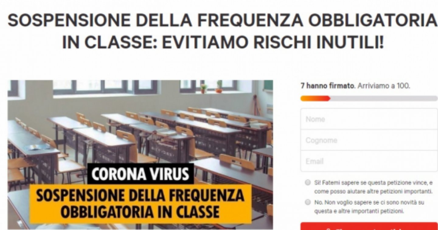 “Se e quando riesporre il proprio nucleo famigliare ad un nuovo rischio pandemico, invece, deve essere una scelta solo e soltanto dei genitori”, scrivono. “Noi genitori chiediamo dunque alla politica: di far prevalere l’11 maggio il principio di cautela, consentendo ai genitori di poter scegliere se far ritornare a scuola i propri figli o continuare con la didattica a distanza; di riflettere con più calma sulle modalità di riapertura a settembre, quando si disporrà di maggiori conoscenze; essendo la scuola dell’obbligo basata sulla collaborazione tra scuola e famiglie, che queste vengano interpellate con maggiore frequenza per raggiungere soluzioni sempre più condivise; di tradurre tutto questo nella sospensione della frequenza obbligatoria In classe (così come avviene in Francia), limitando l’obbligo solo per chi deve sostenere gli esami di fine ciclo scolastico, come in quarta media o per gli apprendisti”.