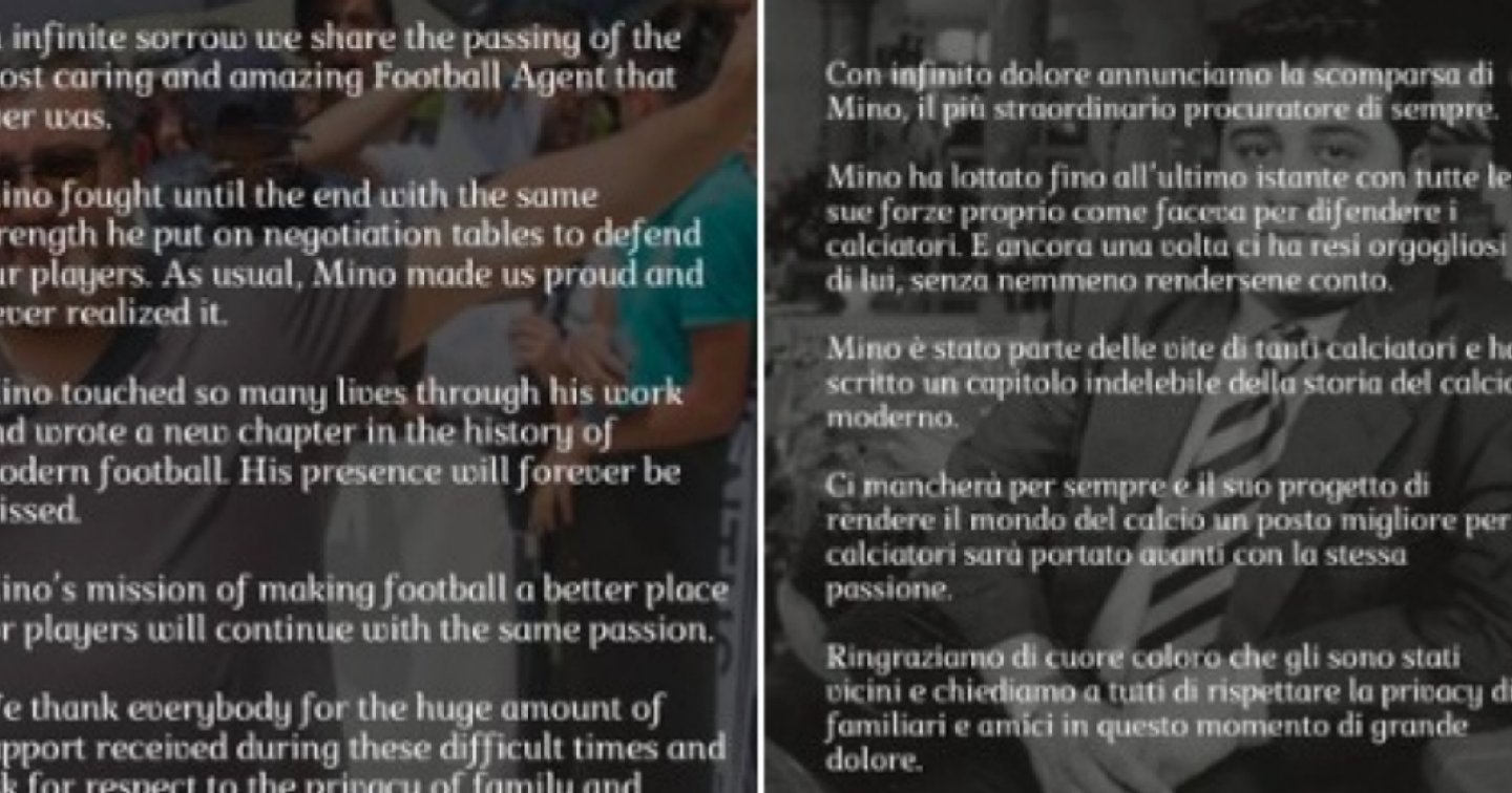 Le sue condizioni erano comunque gravi. E a distanza di pochi giorni, è la famiglia a dare il triste annuncio. "Con infinito dolore annunciamo la scomparsa di Mino, il più straordinario procuratore di sempre", si legge da Twitter.