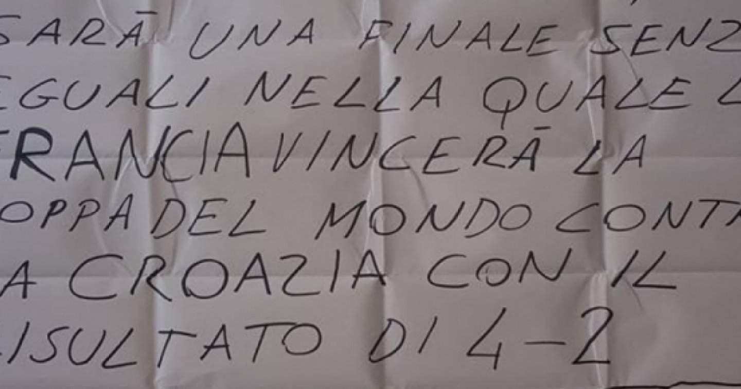 “In un mondiale come questo – si legge nel bigliettino scritto il 7 luglio dal mentalista – dove colpi di scena e sorprese non sono mancati e non mancheranno, ci sarà una finale senza equali nella quale la Francia vincerà la Coppa del Mondo contro la Croazia con il risultato di 4-2”.