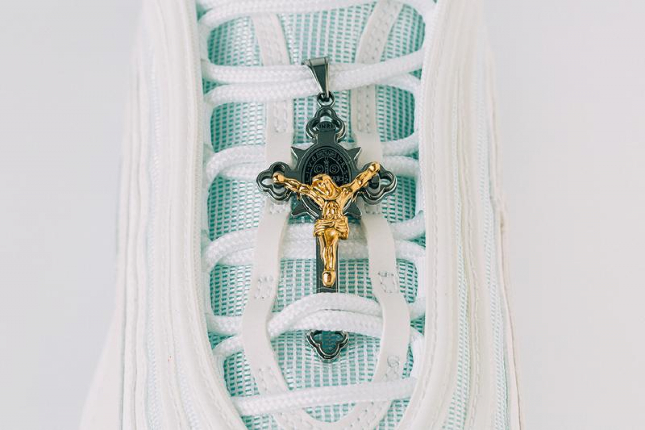 Nonostante la Nike neghi ogni coinvolgimento, la scarpa è un classica Air Max 97 bianca con un crocefisso sui lacci, l’acqua santa prelevata dal fiume Giordano e lo stemma del Vaticano sul fianco con accanto una citazione evangelica”. “Io – continua Greenberg – sono ebreo. L’unica cosa che sapevo di Gesù è che camminava sull’acqua. Da qui l’idea di riempire la suola con 60 centilitri di acqua prelevata dal Giordano e benedetta da un sacerdote”.