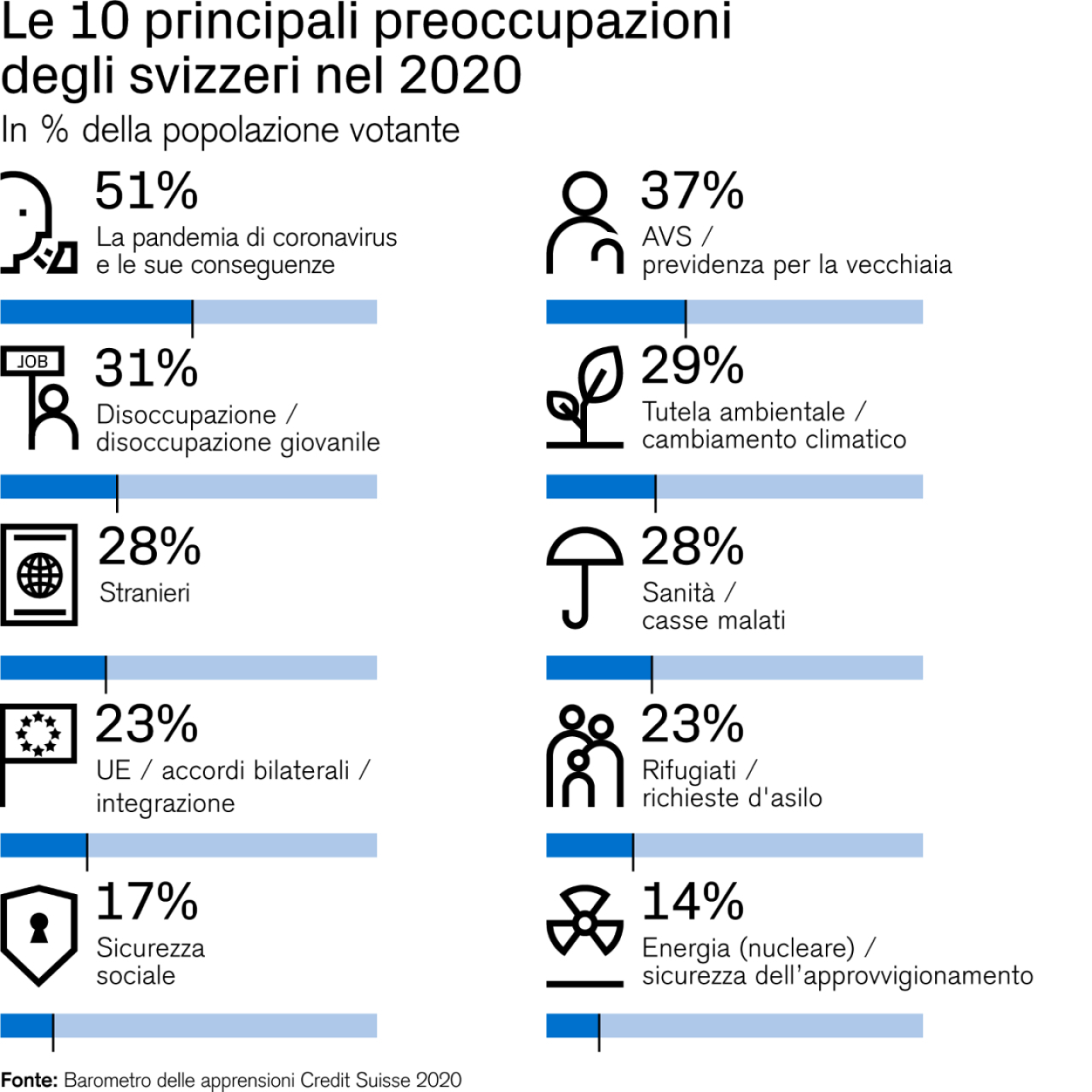Credit Suisse misura le preoccupazioni dei cittadini in Svizzera da 44 anni. Il sondaggio 2020 è stato realizzato fra luglio e agosto dall’istituto gfs.bern tra un totale di 1800 persone con diritto di voto. Il margine di errore è di +/- 2 punti.