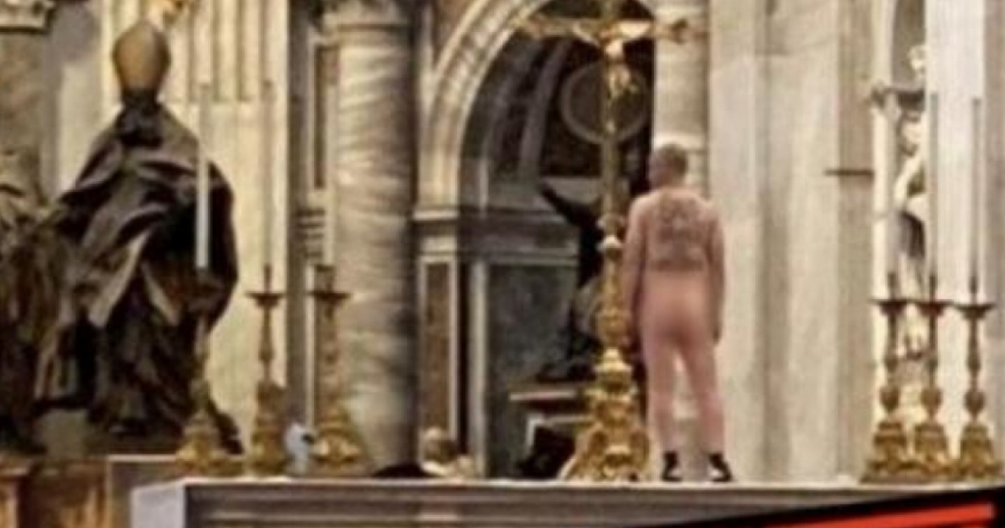 Vicino all'orario di chiusura di ieri, giovedì 1o giugno, è entrato a San Pietro e si è avvicinato all'altare. Qui si è denudato rapidamente per poi salire sull'altare stesso. Non ha detto nulla, nessun grido, nessun movimento: è solo rimasto in piedi, nudo, con sulla schiena la scritta Save children of Ukraina, vale a dire Salvate i bambini dell’Ucraina.