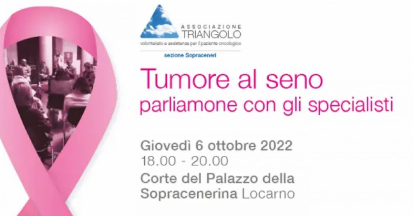 Giunto alla sua quarta edizione, l’evento si terrà giovedì 6 ottobre dalle 18 all 20 nella Corte del Palazzo della Sopracenerina a Locarno. Sarà un’occasione per tutti gli interessati di informarsi, porre domande e dialogare in piccoli gruppi con diversi specialisti che si occupano del tumore al seno e dell’accompagnamento durante la malattia. Saranno a disposizione per rispondere a domande, fornire informazioni e condividere la propria esperienza: oncologo, ginecologo, radiologo, radioterapista, senologo, chirurgo plastico, psicologo, psichiatra, medico di famiglia, genetista, fisioterapista, infermiera in senologia, dietista, parrucchiera, estetista, animatrice gruppo auto-aiuto e volontari dell’Associazione Triangolo. Segue aperitivo offerto.
